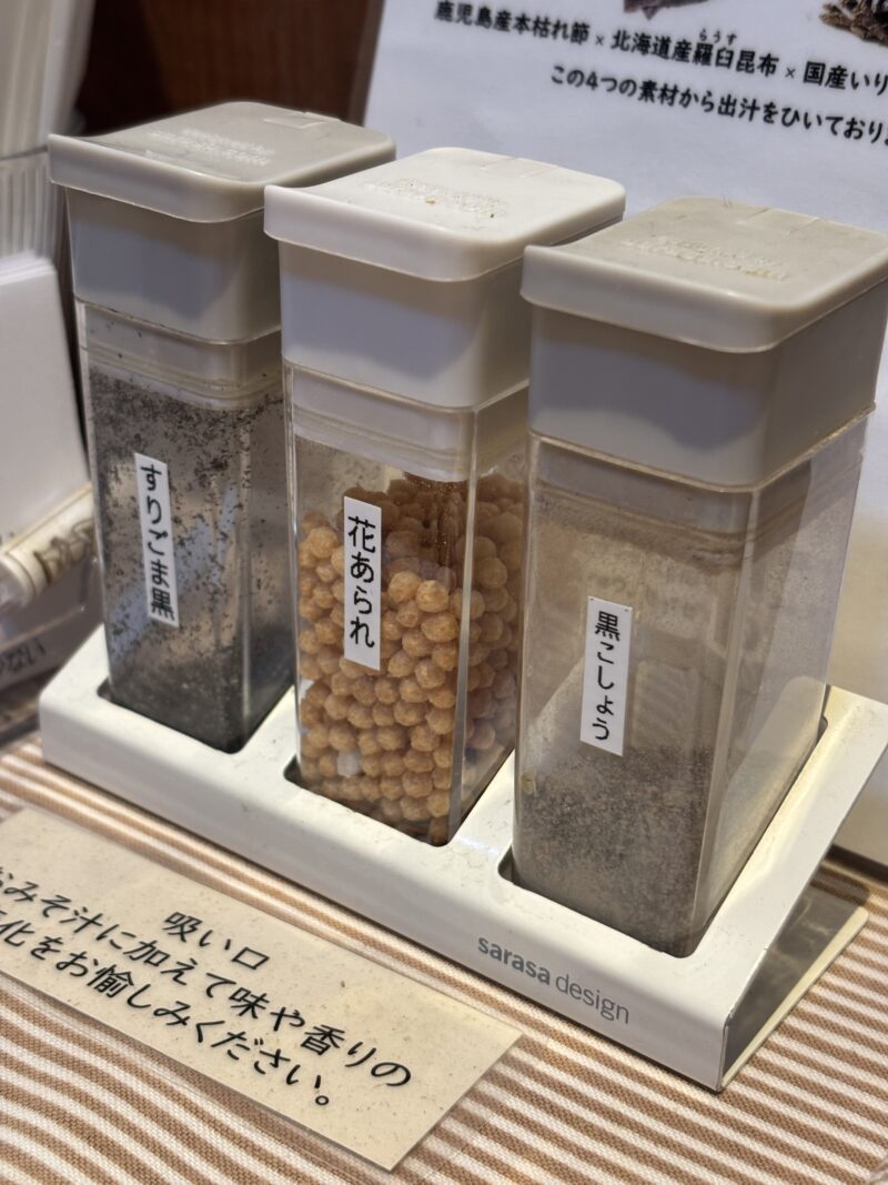 テーブルに味変で吸い口が3種類置いてありますよ。